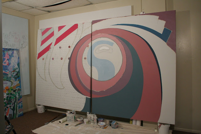 The second motive comes in opposition to the first one since is totally American. I'm embracing it as a sign of my bi-cultural artist which I'm becoming. It has to do with an American sensibility, taste, way of life or whatever you want to call it. It dawned on me after a conversation in my studio with an American collector who wanted to have this piece it just like it is in this picture, unfinished. he told me that he liked the simplicity and the serenity --the key word I realized afterwards-- that the abstract composition and flat colors conveyed.